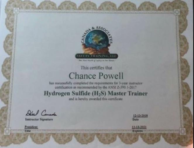 Sulfide (H2S) Master Trainer®” on a training certificate